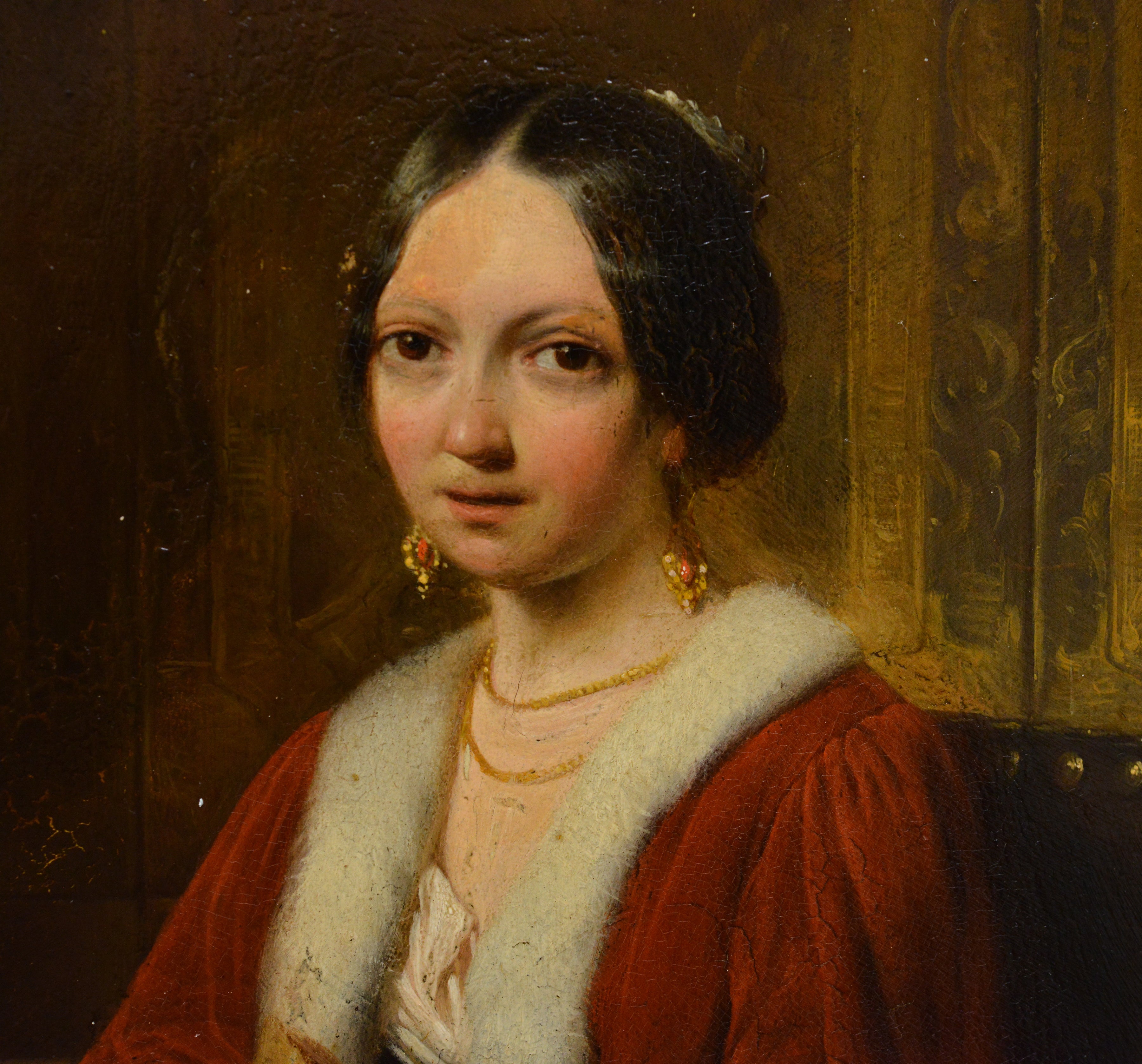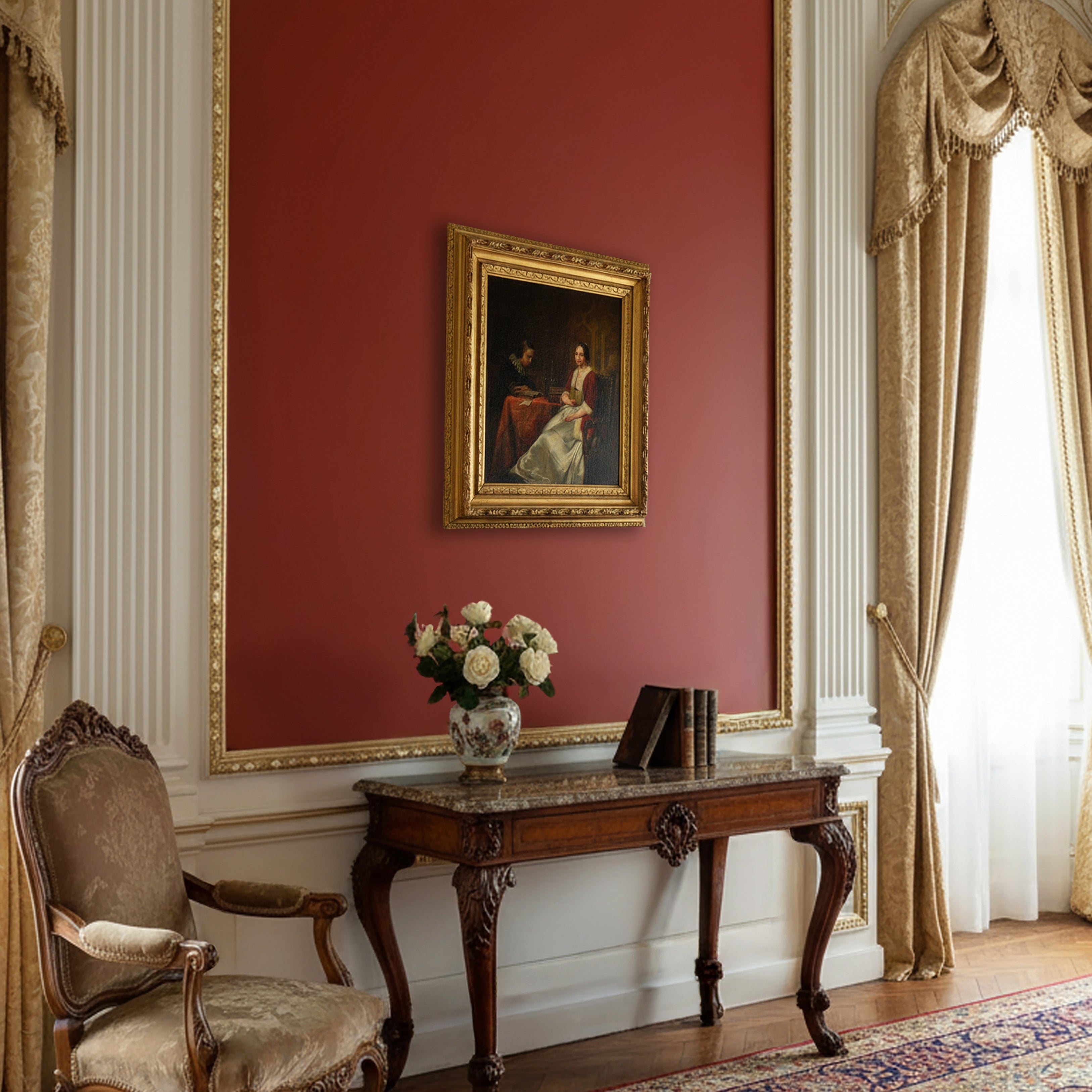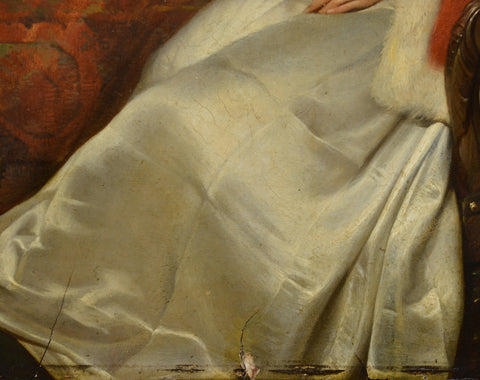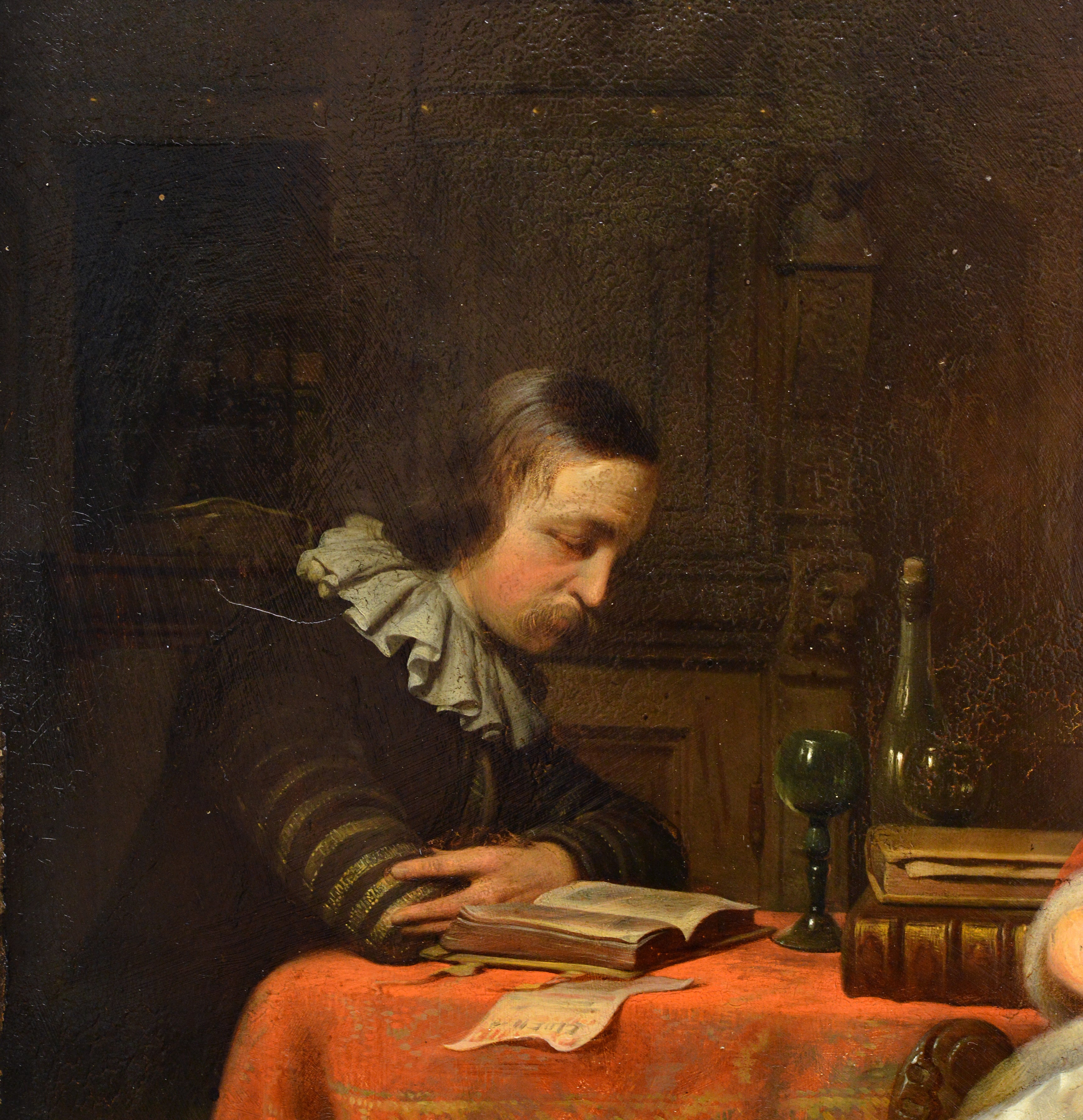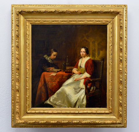 Attributed to Hendrik Hollander (1823-1884). This exquisite example of 19th-century European genre painting portrays a noble couple engaged in reading within a luxurious interior scene. The young aristocratic woman, elegantly positioned in her leather-upholstered armchair, is dressed in a beautiful white silk gown with a striking red velvet cape trimmed in soft fur draped gracefully over her shoulders. Her golden jewelry adorned with precious stones clearly indicates her high noble status and refined taste. Her gentleman companion, wearing a dark doublet with sleeves embellished with gold thread embroidery and a traditional ruff collar, carefully examines his book at a table covered with richly patterned fabric. The composition showcases masterful painting technique characteristic of Dutch artistic traditions, with exceptional attention to period details, intricate textile textures, and atmospheric lighting effects. This beautiful work in classical academic style will certainly become a magnificent addition to any serious collection of European art.