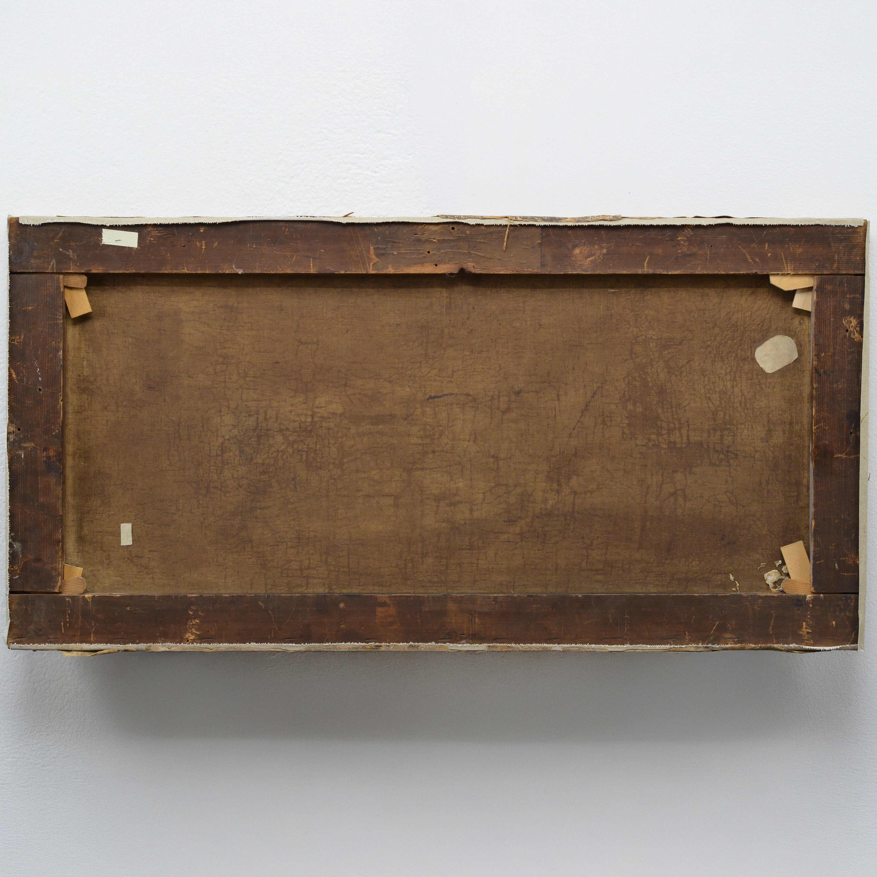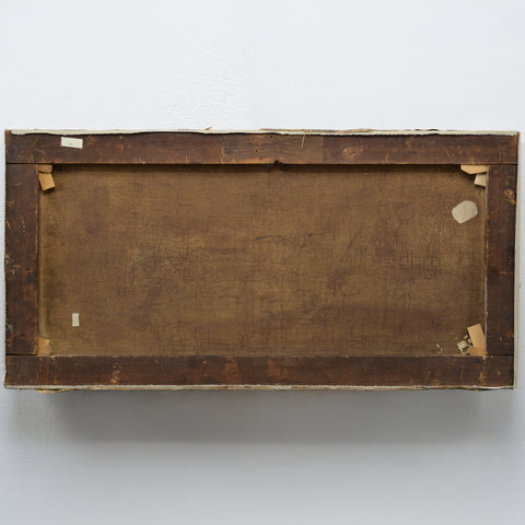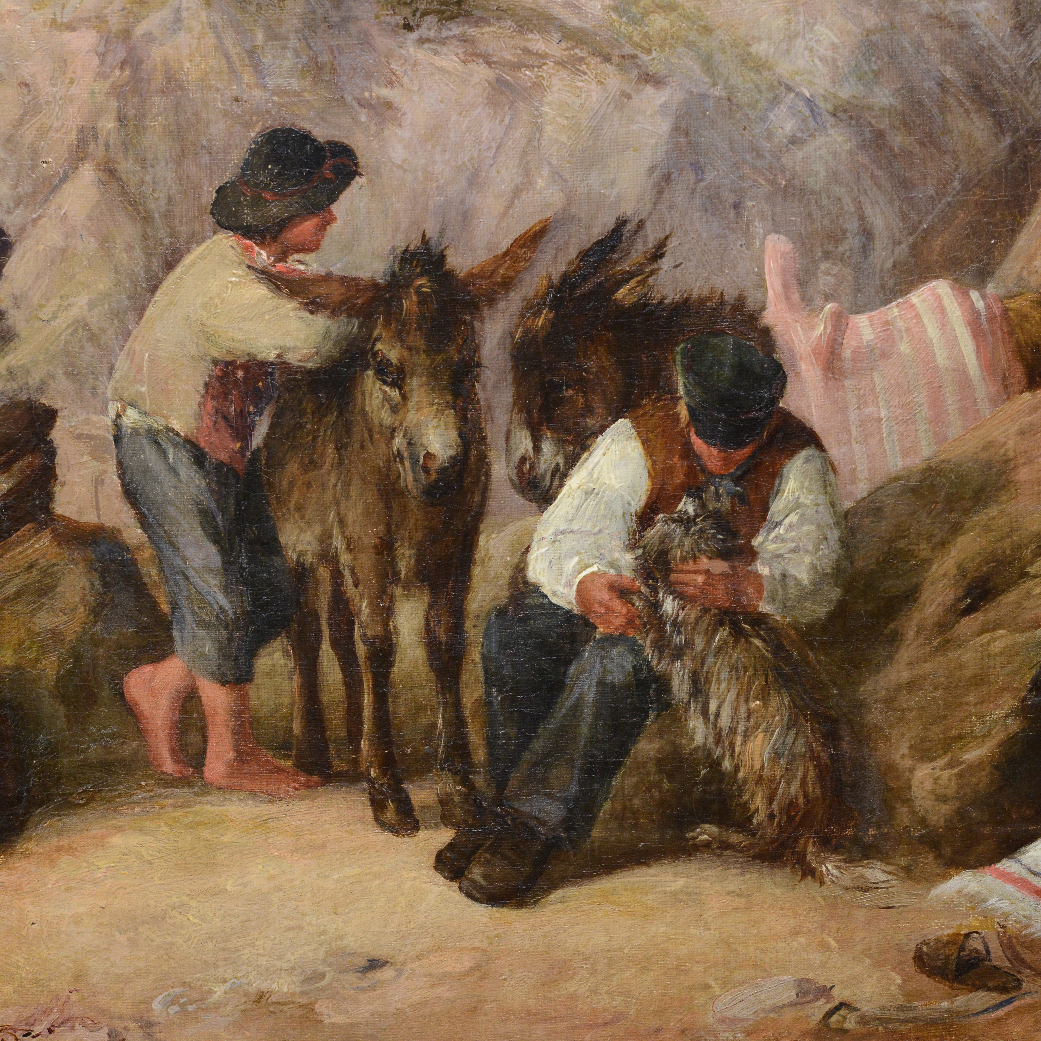 This exquisite antique panoramic late 19th-century oil painting presents a tranquil Mediterranean coastal scene bathed in sunset light. Two donkey drivers have paused to rest on a sandy beach, surrounded by dramatic rocky cliffs. One man tenderly strokes his loyal dog while his companion attends to their weary donkeys. Sailing ships slip across the horizon beneath a golden evening sky, creating depth in the composition, while a lone seagull circles forlornly above the water, adding dynamic movement to the otherwise tranquil scene. The work perfectly captures how European artists of the period romanticized the simple dignity of common everyday labor. Every detail reveals the painter's mastery: the weathered textures of seaside rocks, the natural fur of the animals, and the gentle movement of sea waves. An excellent example of European genre painting from the 1800s, ideal for collectors who appreciate maritime and pastoral subjects.