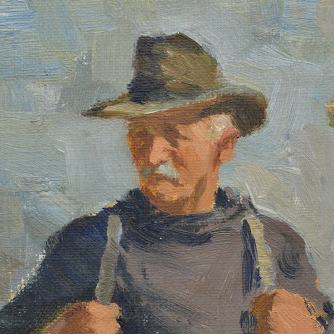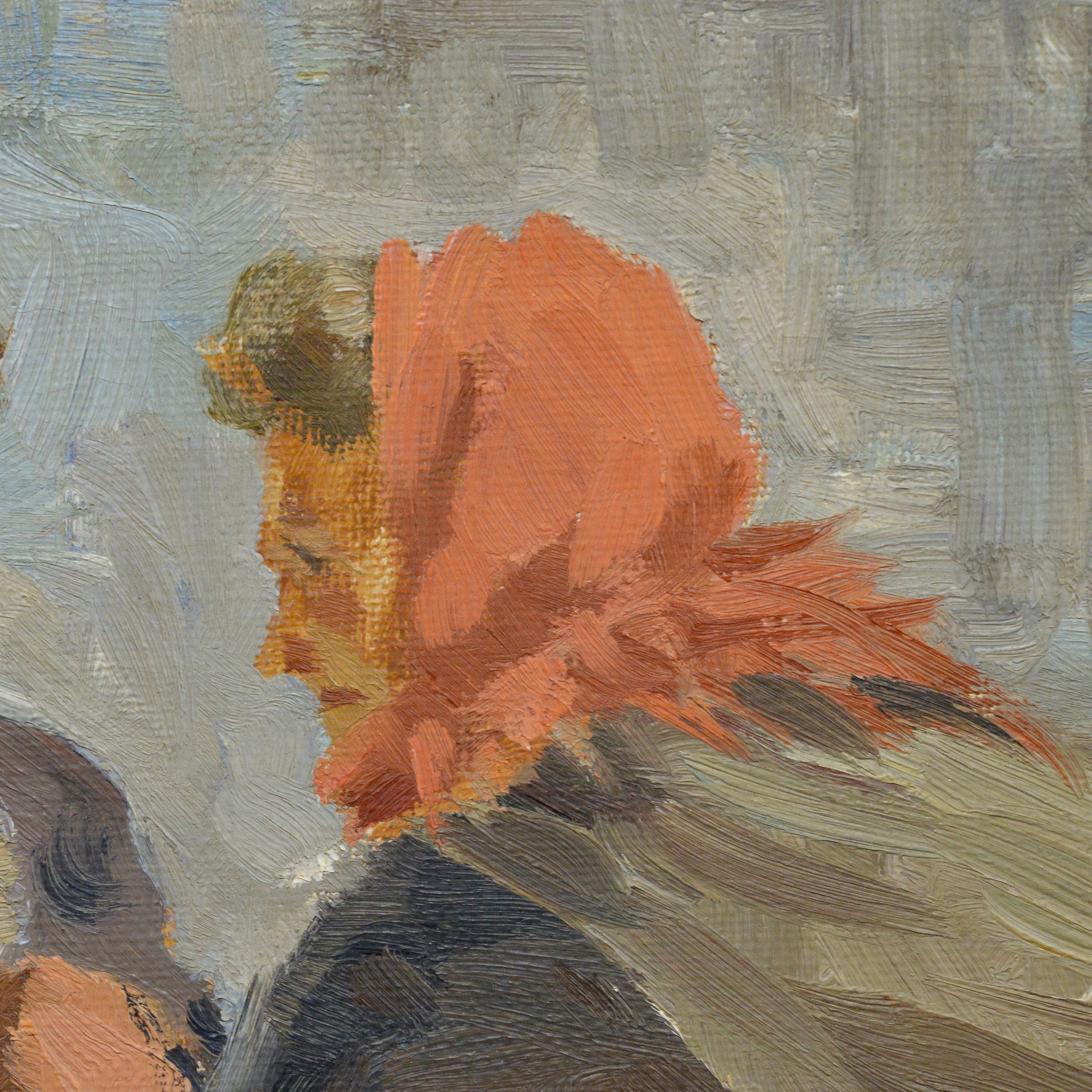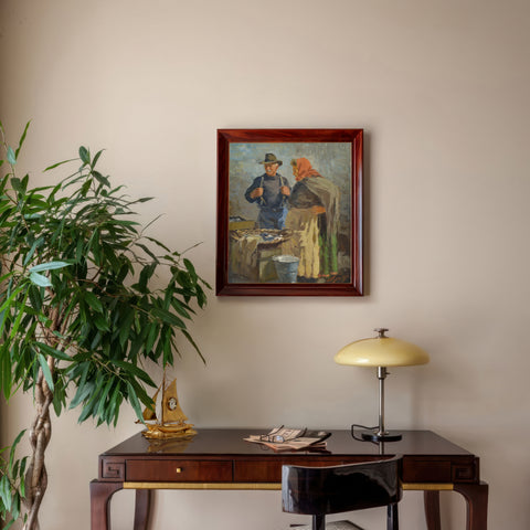 This antique oil on canvas from the 1920s, attributed to the Danish artist Søren Christian Bjulf (1890 - 1958), captures a spirited fish market at Gammel Strand, Copenhagen. The scene unfolds at a fish stall where a fisherman and a woman - presumably his wife - sell his freshly caught haul. This plein air study is executed with broad, loose brushstrokes in the Danish realist tradition, employing a muted color palette punctuated by small vibrant accents. The artist demonstrates careful attention to the characters' personalities and surrounding details, the interplay of light and shadow, all work together to create an authentic mood and atmosphere. Like many artists of the era inspired by revolutionary and democratic ideals, Bjulf sought to portray the essential qualities and characteristics of working-class life in its many facets.