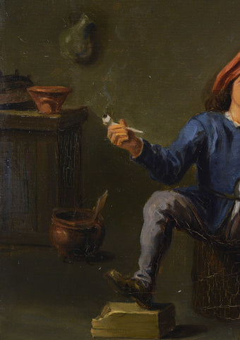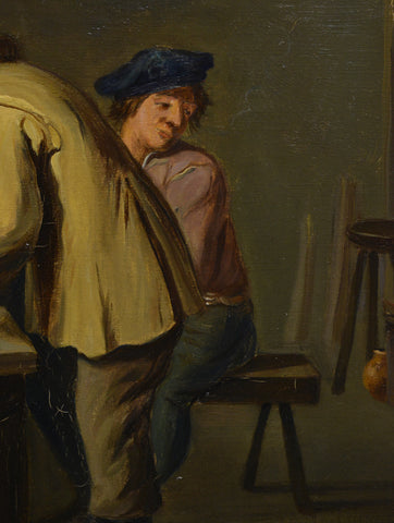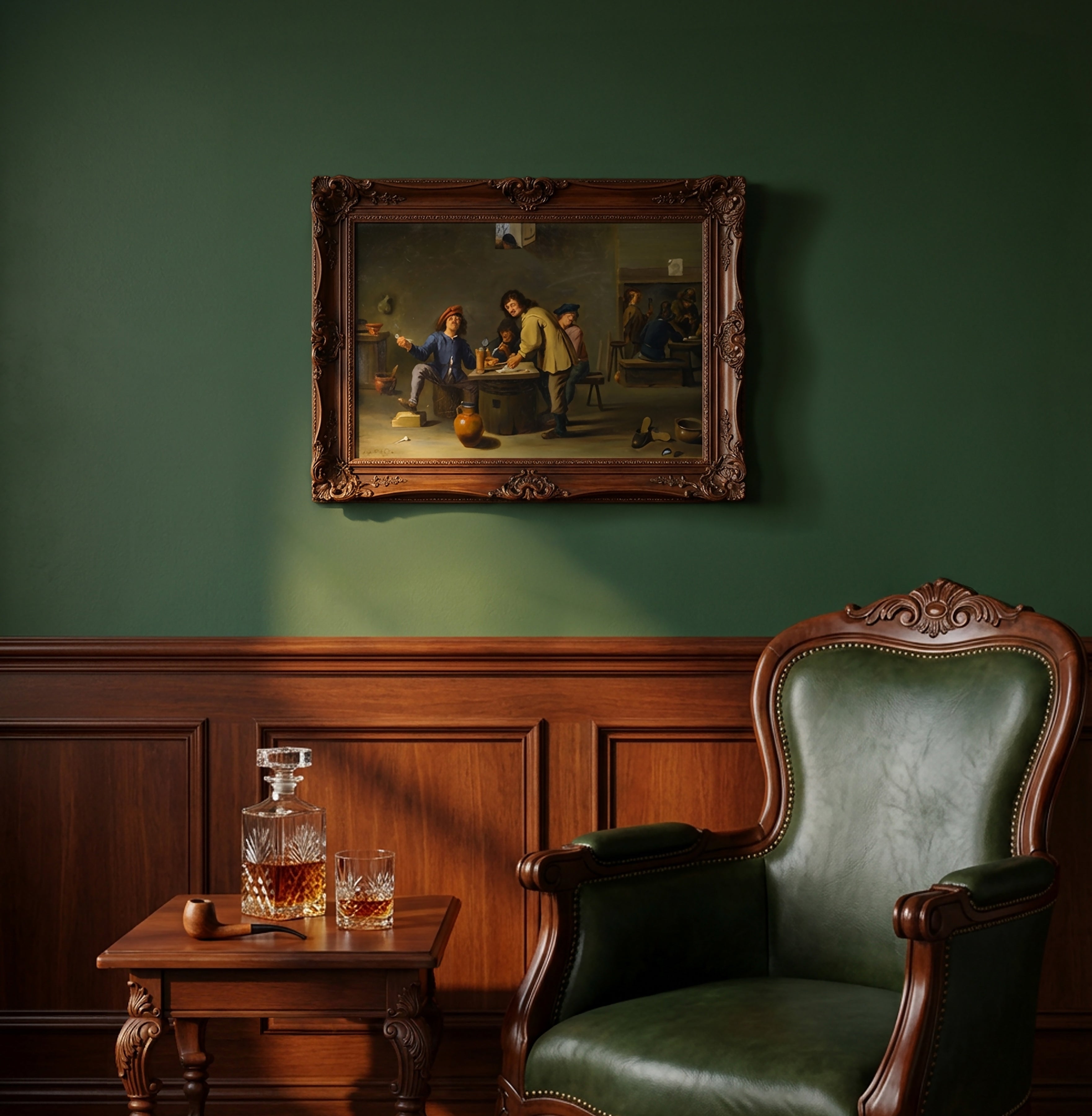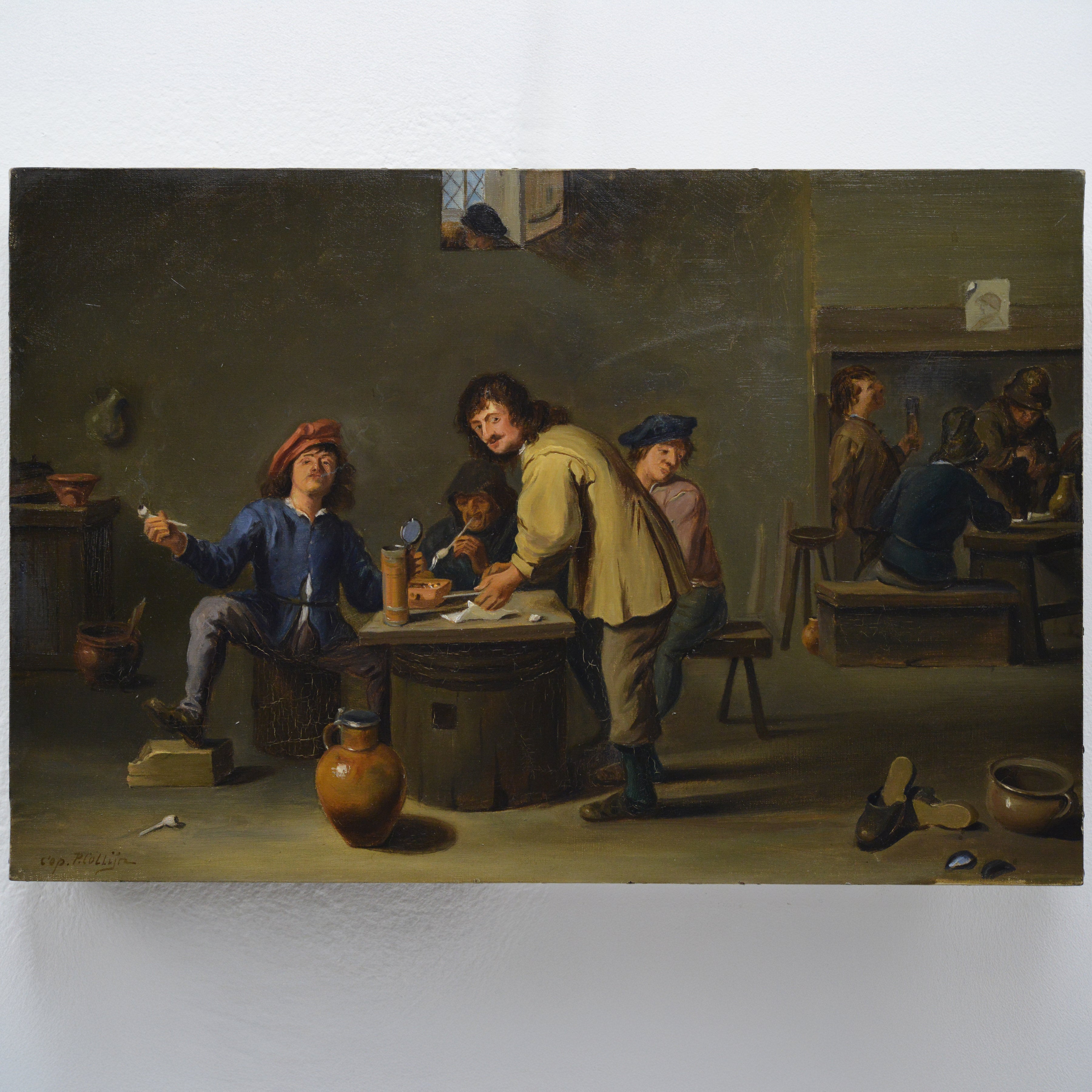 Early 20th century oil on canvas by Swedish painter Per Collijn (1878-1961), inspired by David Teniers the Younger's "Tavern Scene with Pipe-smokers" (1610-1690). The scene shows common folk relaxing in a tavern, naturally separating into two gatherings around different tables - one group smoking pipes and drinking ale, the other concentrating on a card game. The painting employs the warm color scheme favored by old Flemish artists, punctuated by deliberate touches of brighter hues, and sunlight angles through the windows to bathe the room. The work fully reflects the particular skills of Teniers, while retaining its individual imprint thanks to Collijn's interpretation. Collectors who appreciate Flemish genre painting will find this piece particularly appealing.