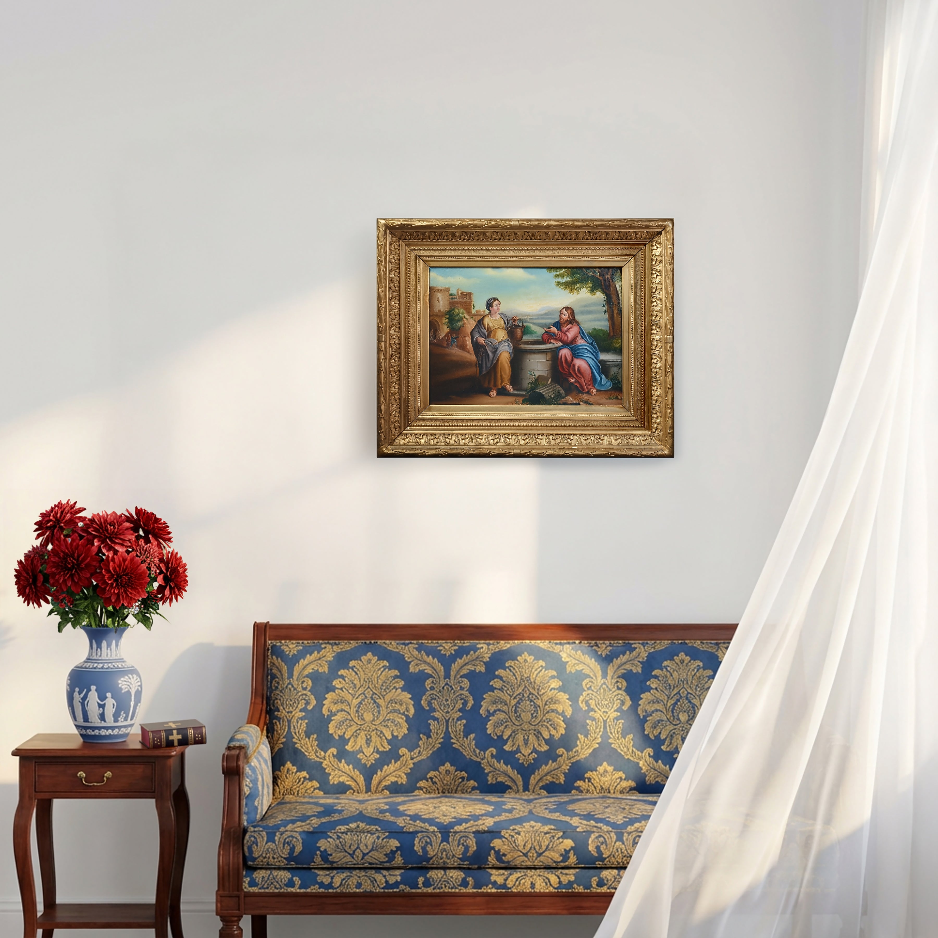 This antique religious painting shows a biblical scene depicting Jesus conversing with the Samaritan woman at Jacob's Well near Sychar (John 4:4 - 42). The artist employs a balanced composition with spatial depth and perspective, anchored by two expressive central figures placed on opposite sides of the well. The disciples of Jesus appear in the background to the left, returning from town with provisions, which draws us deeper into the Gospel narrative. The careful details, harmonious colors and gentle tonal gradations reveal an academic and professional approach combining spiritual content with practiced execution.