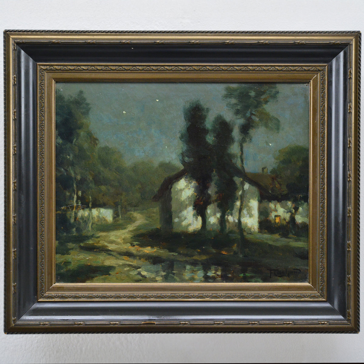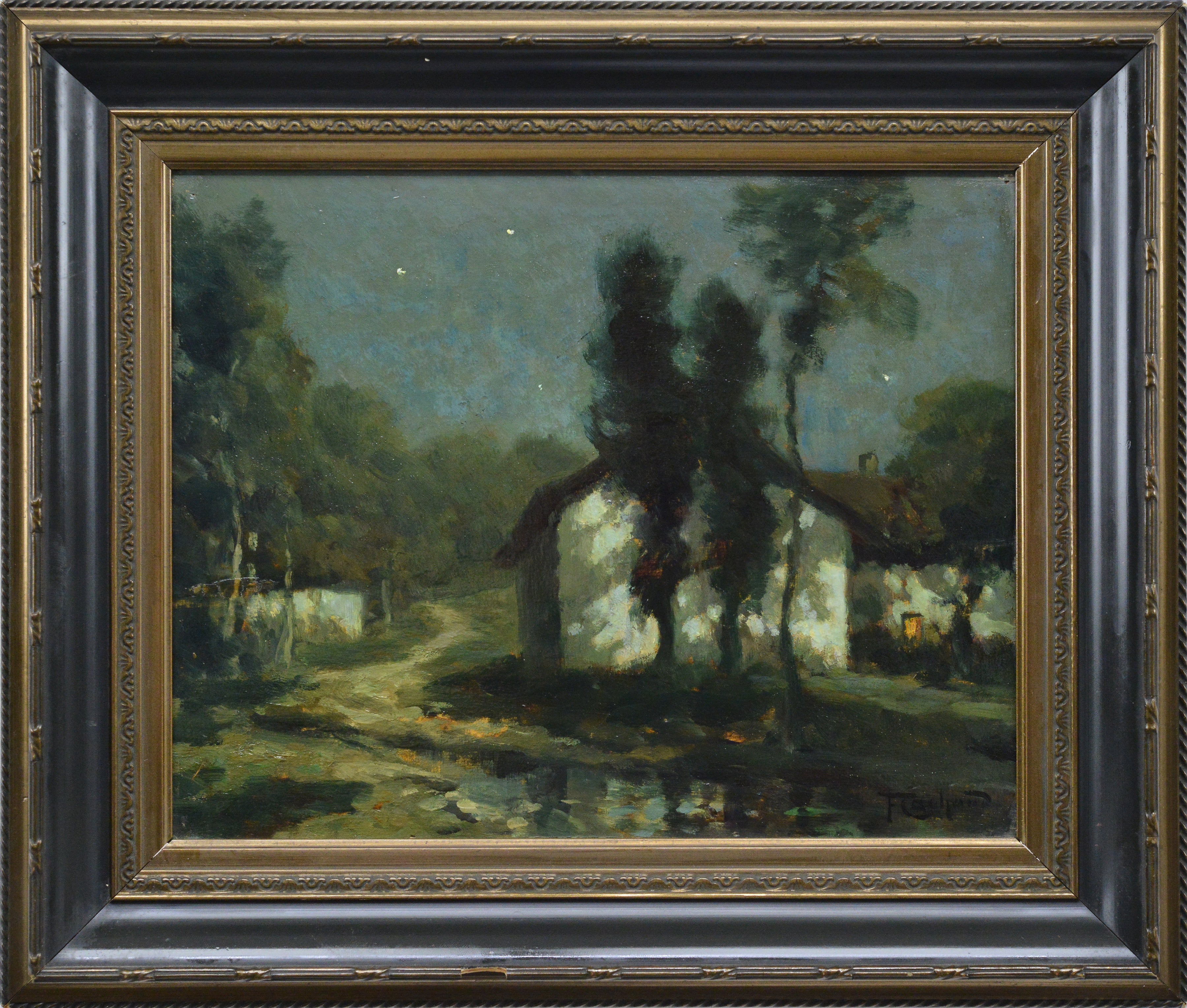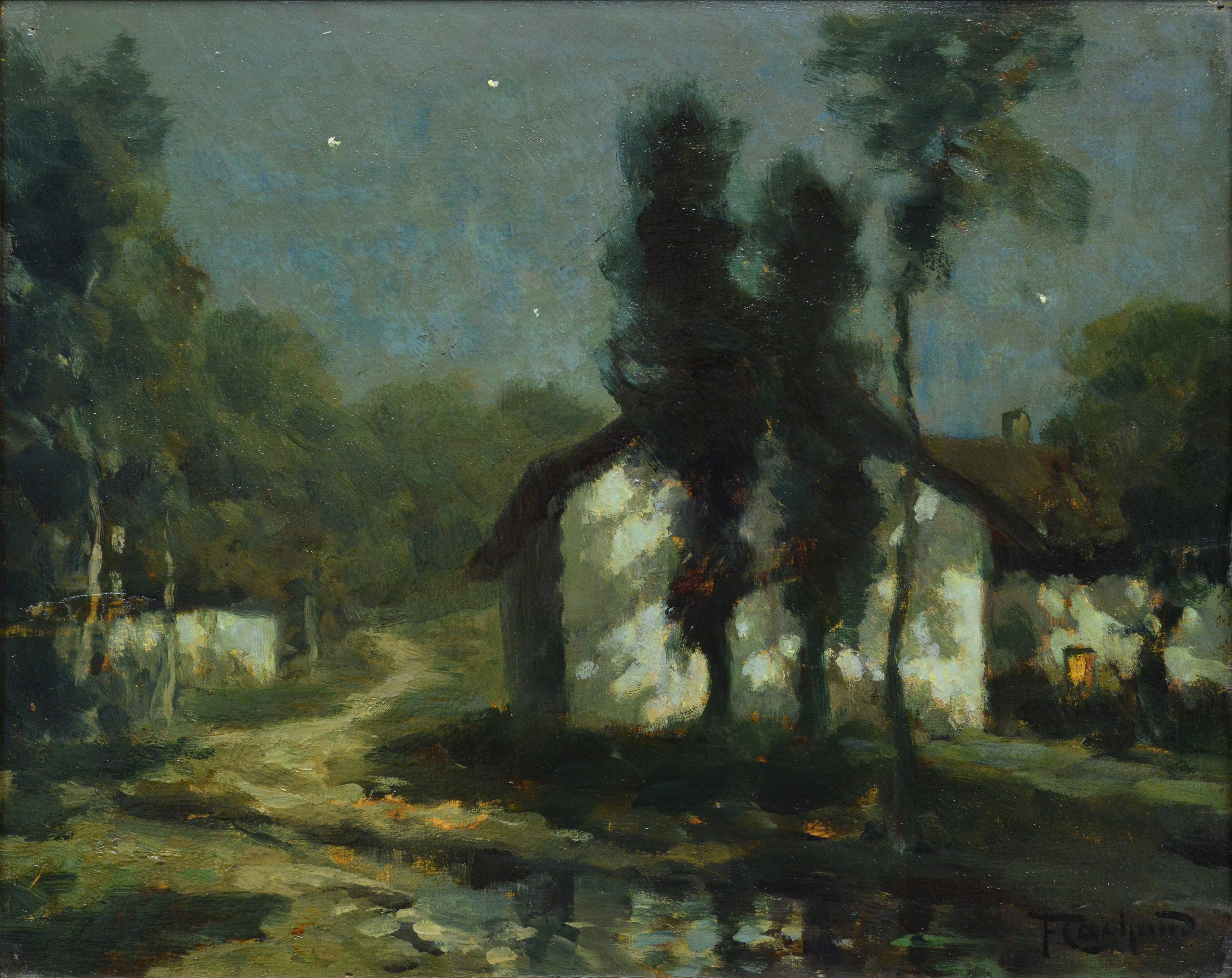 This early 20th century oil painting on wooden panel, titled "Chemin de Guicherd. Savoie Nuit," is attributed to François Charles Cachoud (1866-1943), a French master of nocturnes. While Cachoud also painted portraits and still lifes, he achieved his greatest recognition for his evocative nighttime landscapes. This captivating nocturnal scene transports the viewer to a quiet French village bathed in brilliant moonlight. A cloudless starry sky stretches overhead while trees cast mysterious shadows across whitewashed house walls. A winding country road features enigmatic reflections in a puddle, adding depth and atmosphere to the composition. Executed with confident, bold brushstrokes characteristic of early 20th century French painting, the work demonstrates the artist's masterful command of nocturnal lighting effects and atmospheric depth. The interplay of light and shadow creates a serene yet mysterious mood, exemplifying the nocturne genre at its finest.
