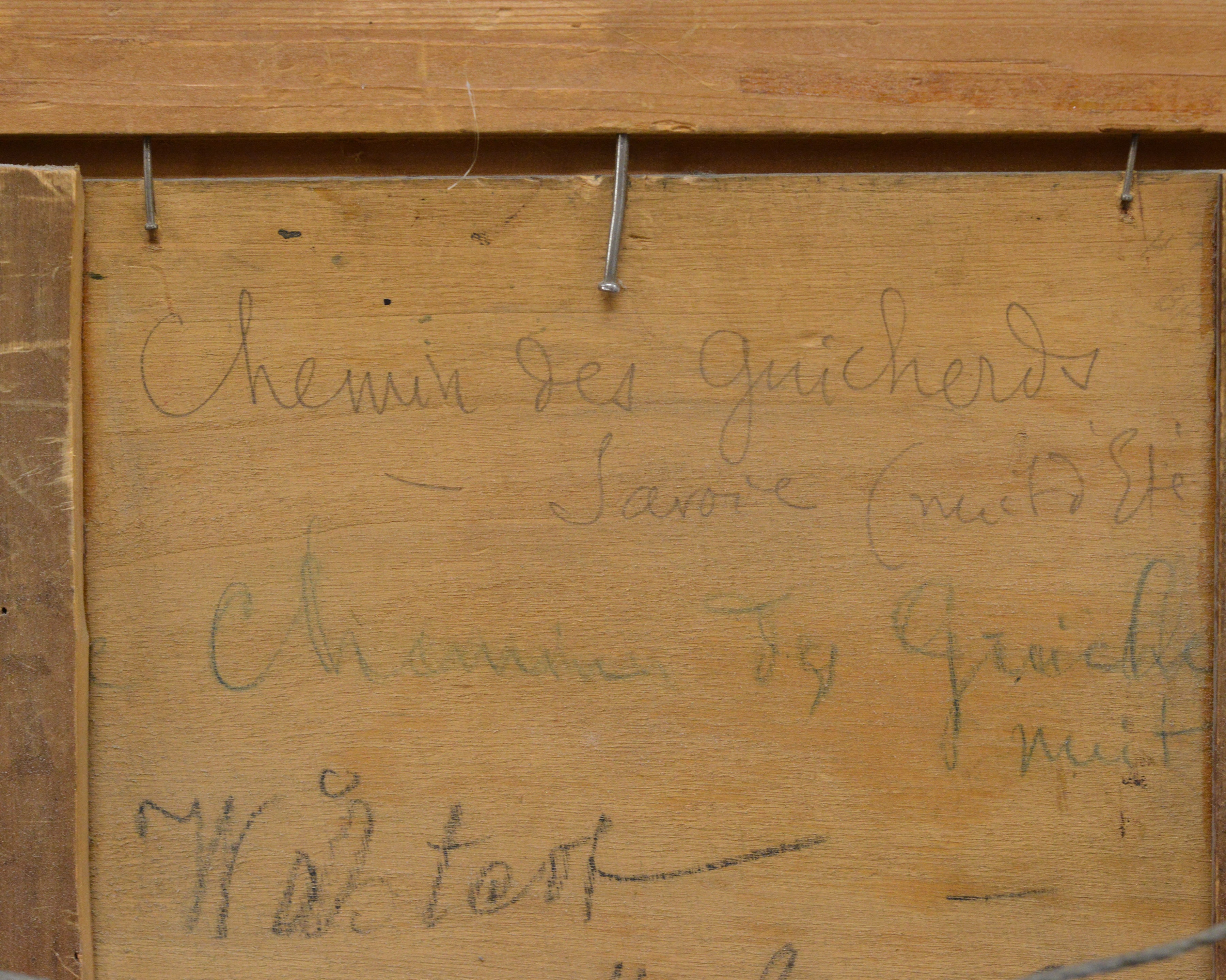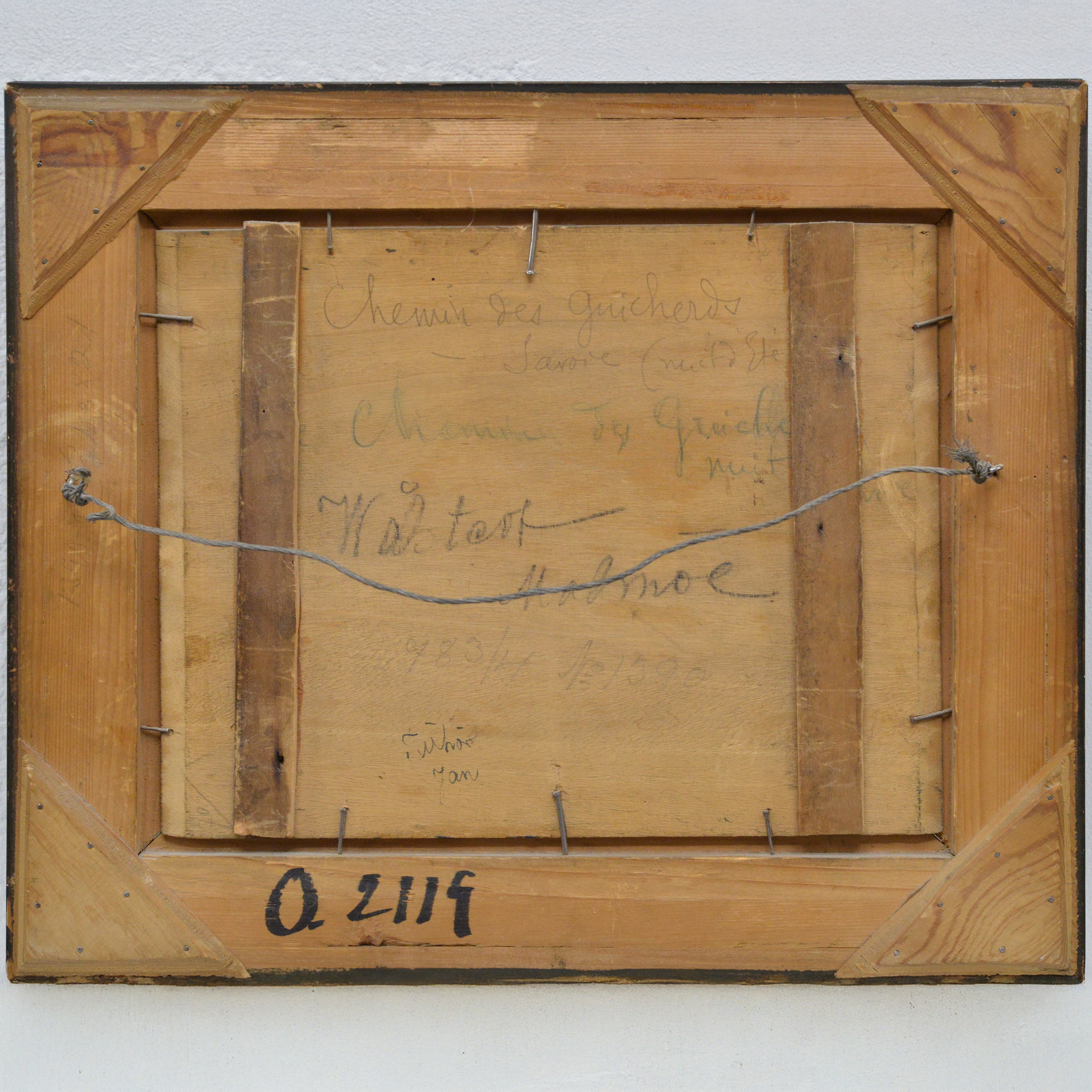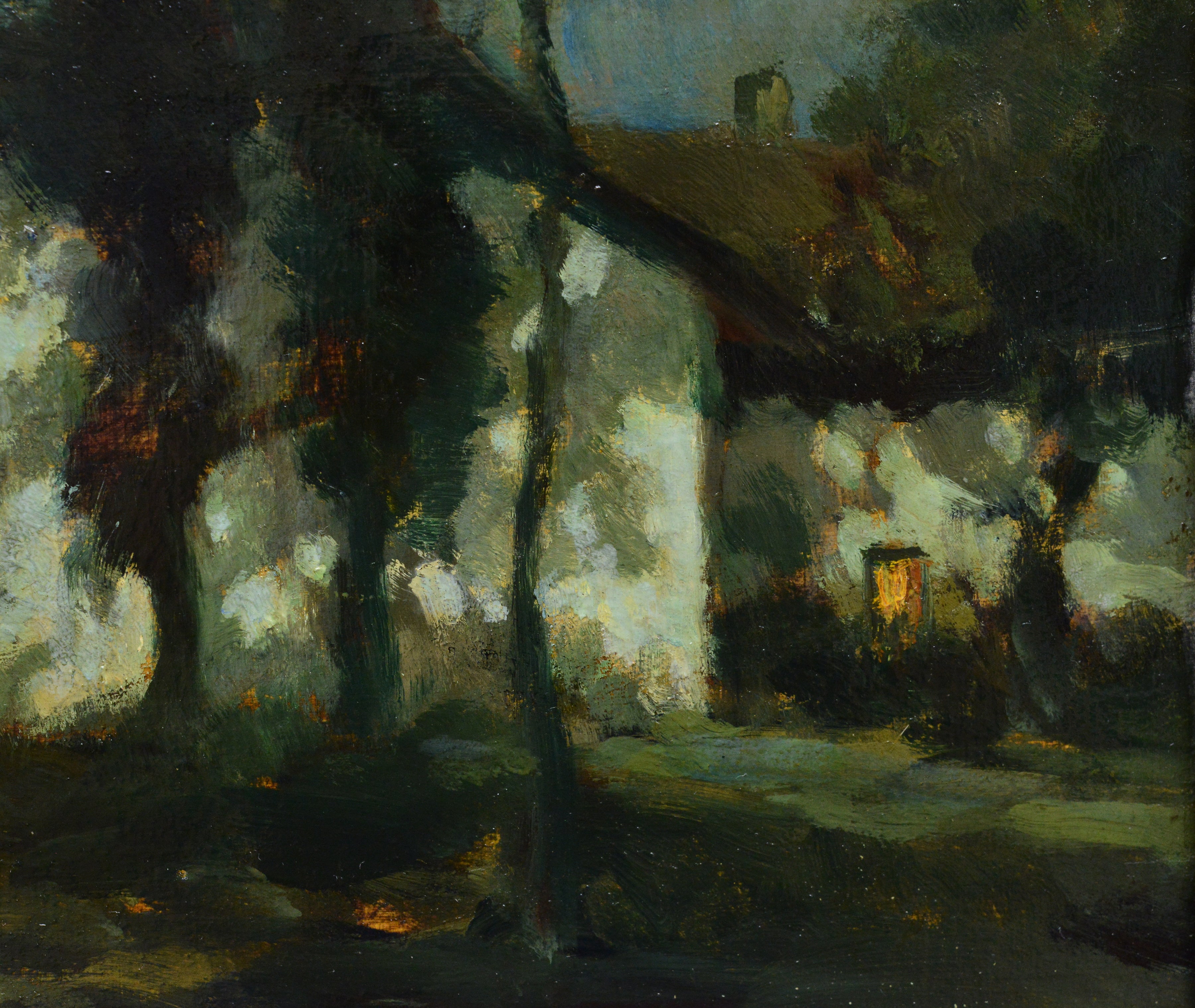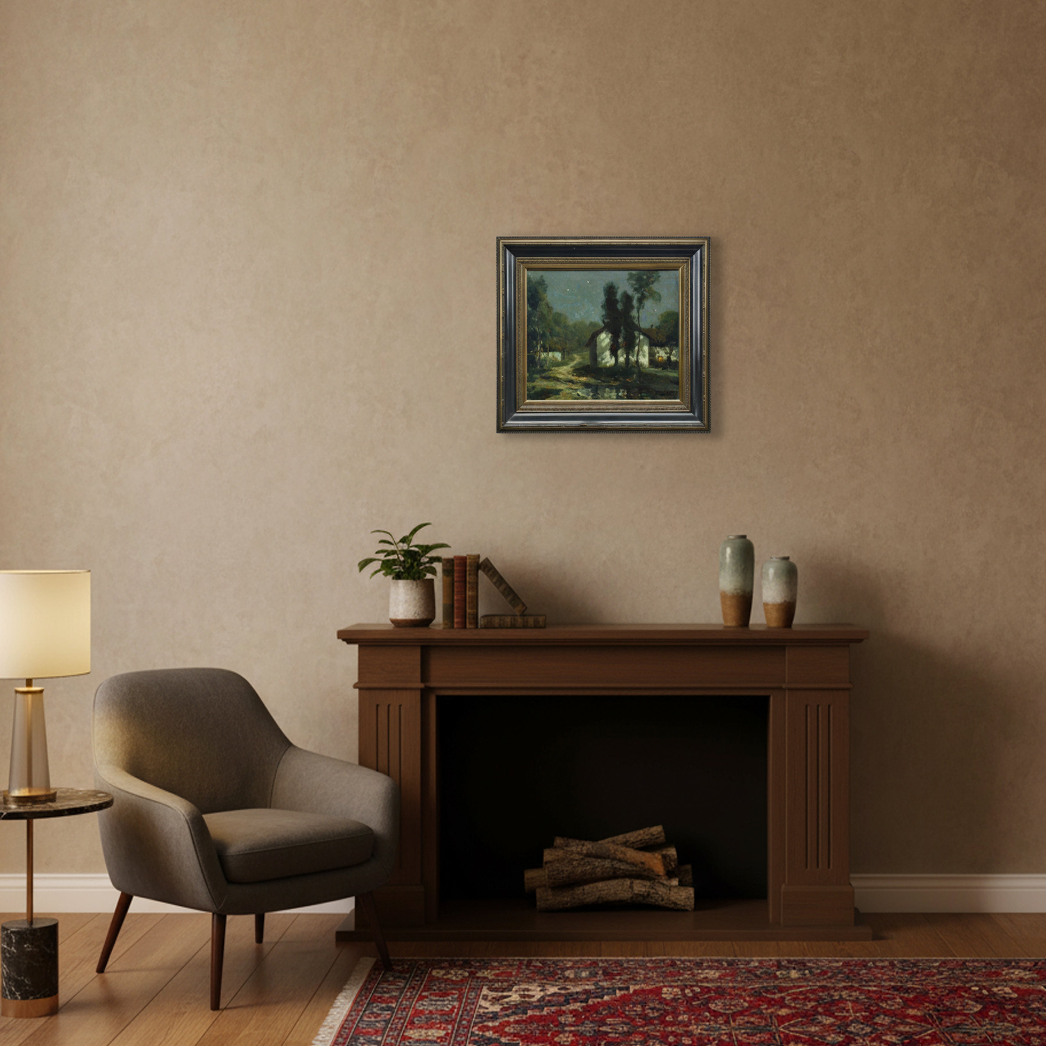 This early 20th century oil painting on wooden panel, titled "Chemin de Guicherd. Savoie Nuit," is attributed to François Charles Cachoud (1866-1943), a French master of nocturnes. While Cachoud also painted portraits and still lifes, he achieved his greatest recognition for his evocative nighttime landscapes. This captivating nocturnal scene transports the viewer to a quiet French village bathed in brilliant moonlight. A cloudless starry sky stretches overhead while trees cast mysterious shadows across whitewashed house walls. A winding country road features enigmatic reflections in a puddle, adding depth and atmosphere to the composition. Executed with confident, bold brushstrokes characteristic of early 20th century French painting, the work demonstrates the artist's masterful command of nocturnal lighting effects and atmospheric depth. The interplay of light and shadow creates a serene yet mysterious mood, exemplifying the nocturne genre at its finest.