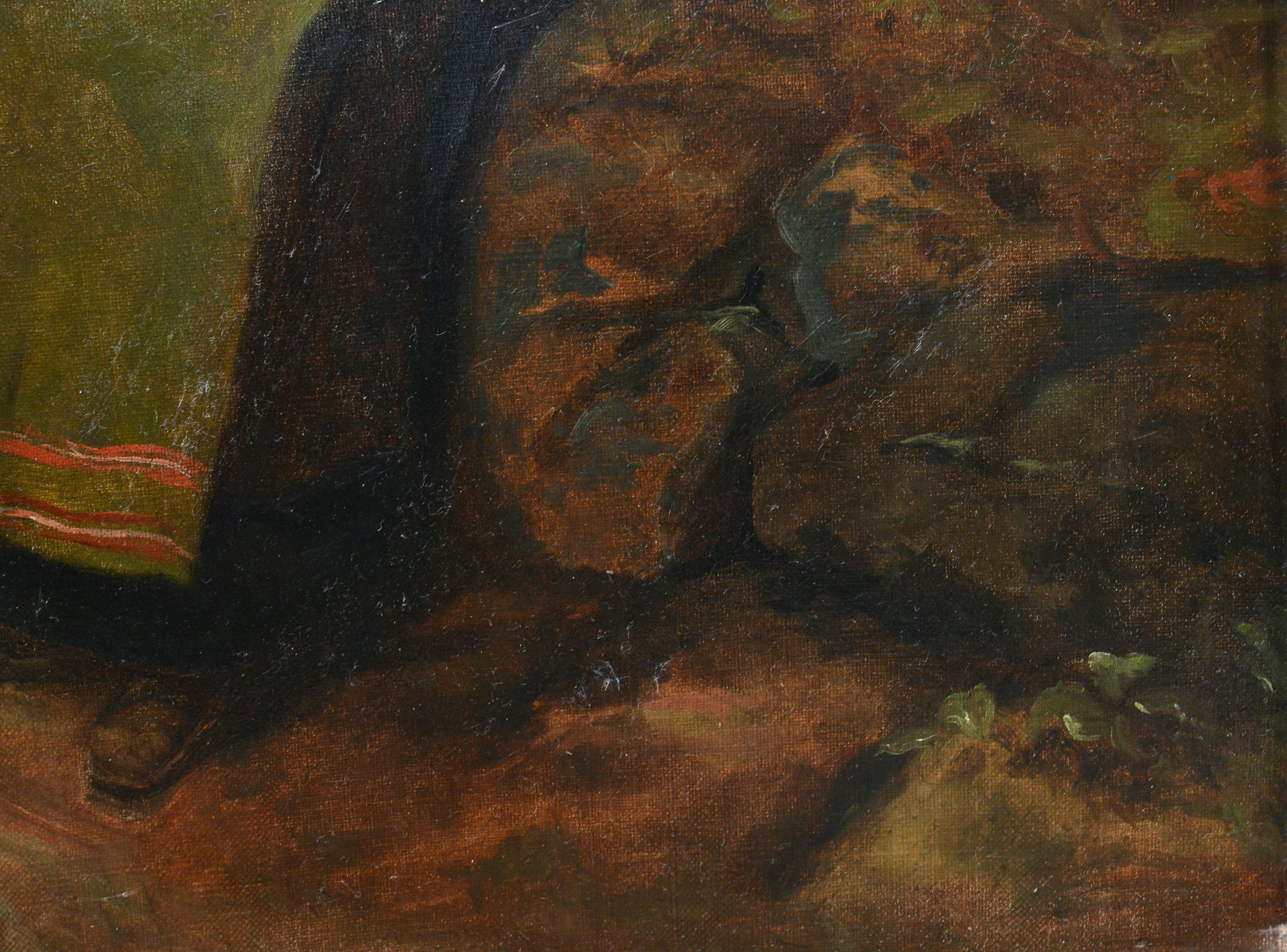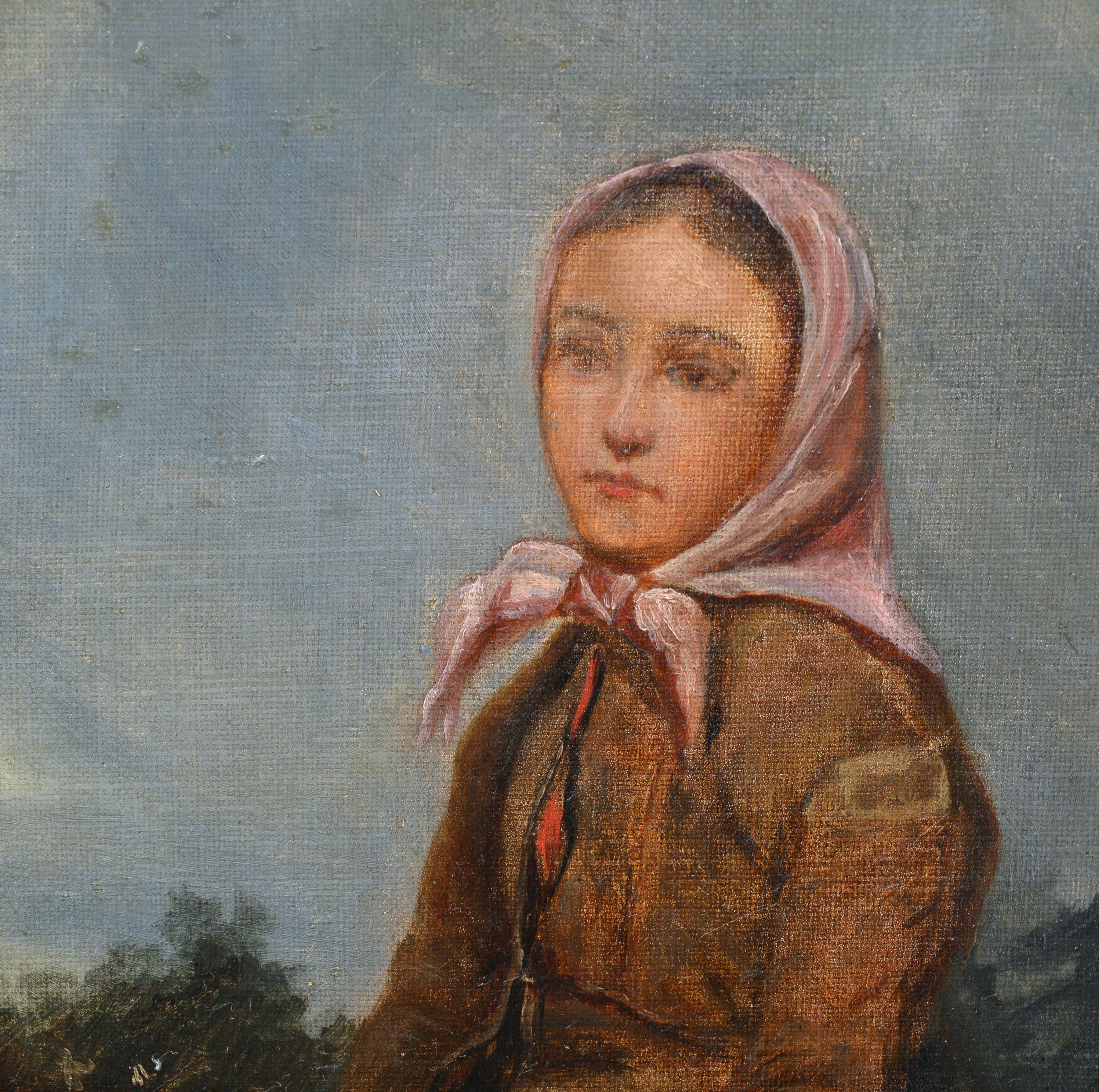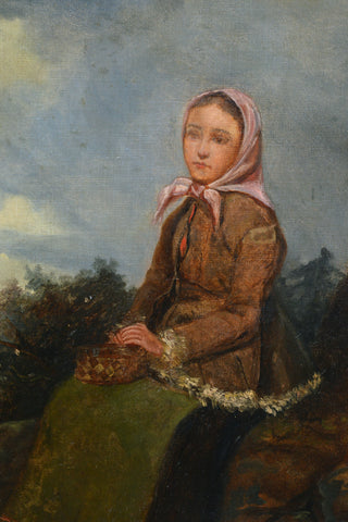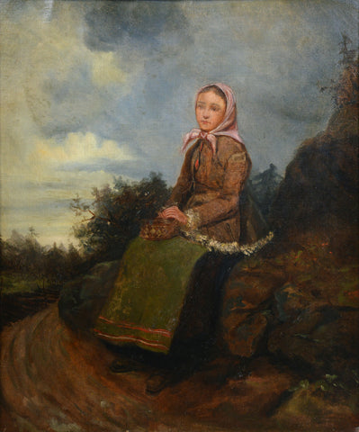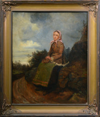 This enchanting original oil painting on canvas depicts a young Scandinavian peasant girl in traditional folk costume who has paused on a winding road to rest. The melancholic beauty wears a warm short fur jacket and pink headscarf and holds a small basket on her lap. In the background stretches an overcast sky with storm clouds, and the rocky landscape with sparse vegetation realistically conveys the coolness of harsh northern nature. The painting reveals the artist's refined academic approach through careful attention to detail and masterful handling of light and shadow. What particularly strikes us is the virtuosic way the artist navigates between somber and warm tones, creating a delicate balance that brings depth and emotion to the composition.