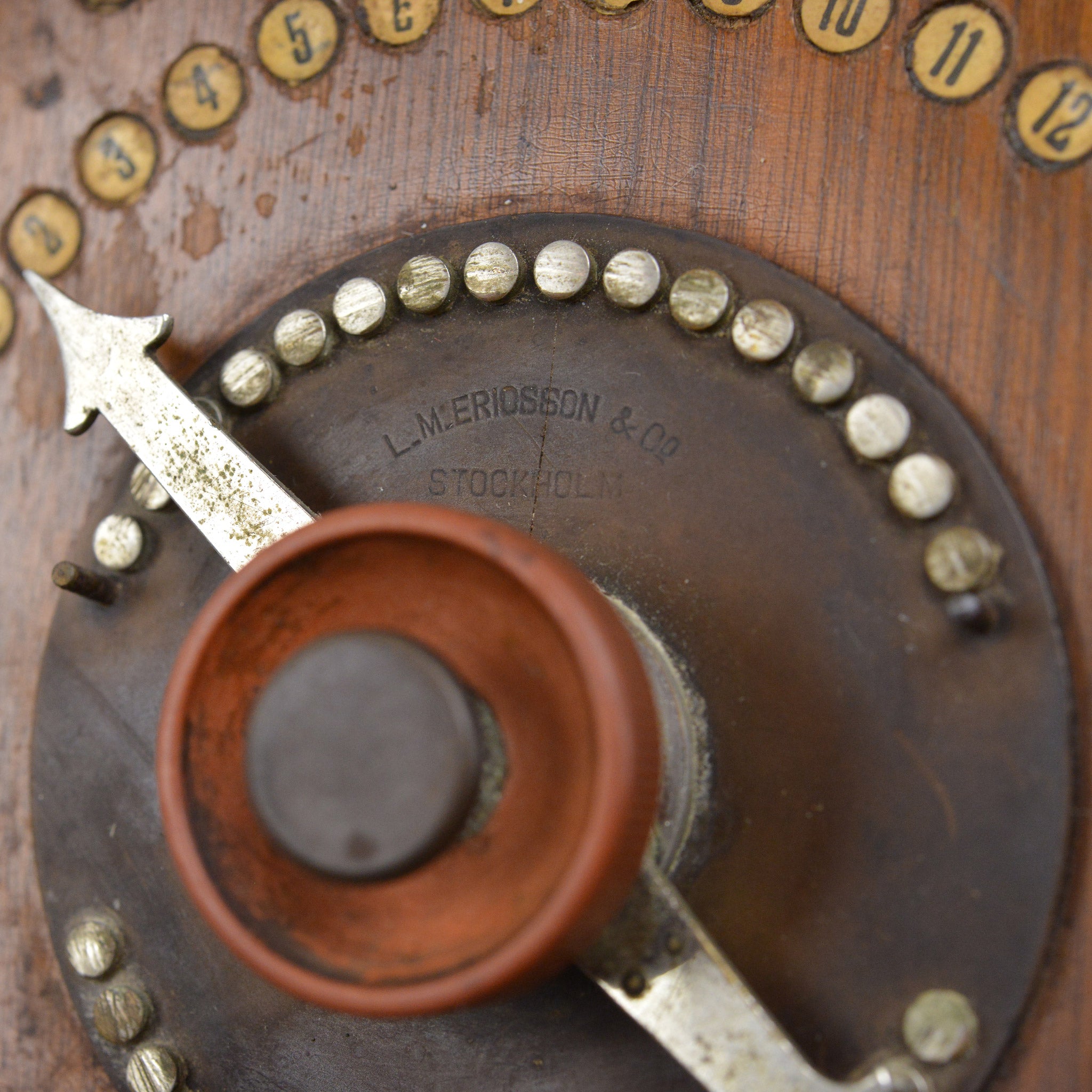 Maker: Swedish manufacturer AB L.M. Ericsson & Co., type HA 100/15, with handset RE 6000, as presented in the 1914 catalog. Serial number 655955 dates its production back to 1907.