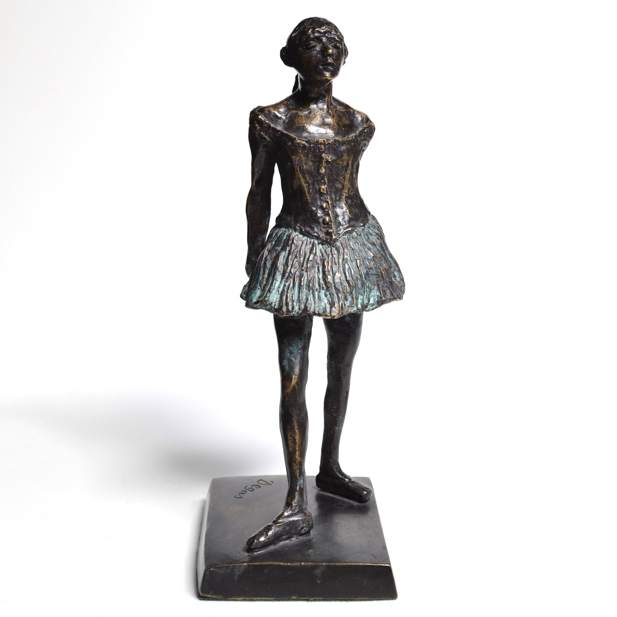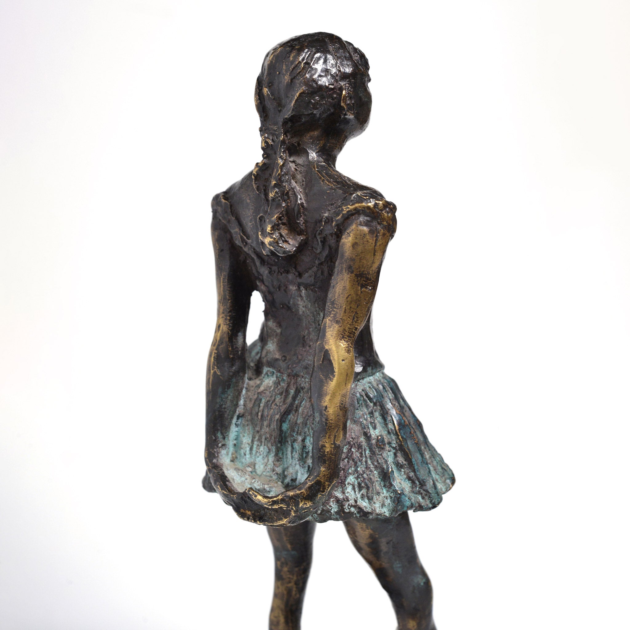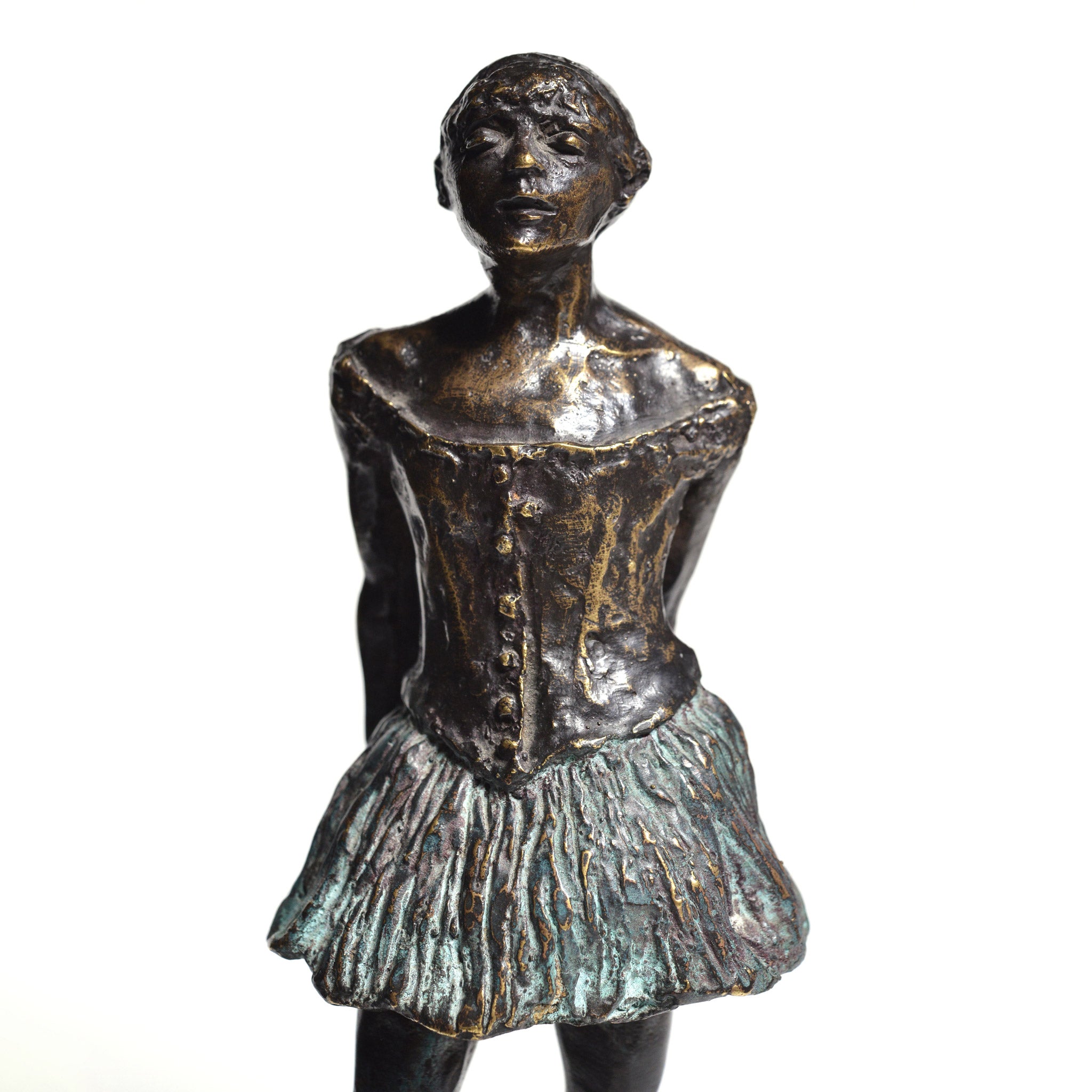 This magnificent bronze sculpture, cast in the first half of the 20th century, represents a masterful reinterpretation of Edgar Degas' iconic masterpiece, "Little Dancer of Fourteen Years". The work brilliantly captures a fleeting moment of rest during an intense ballet rehearsal. A complex two-tone patina lends the sculpture a particular aesthetic elegance: the deep dark-brown hue of the figure itself contrasts strikingly with the rich green patina on the ballerina's tutu. The textured, deliberately sketch-like surface of the metal masterfully imitates Degas' extraordinary modelling style, catching the slightest play of light and shadow. It is a deeply emotional work of art, capable of filling any interior with the charm of French Impressionism.