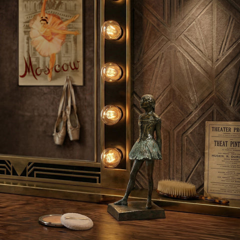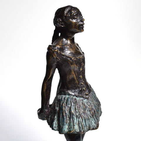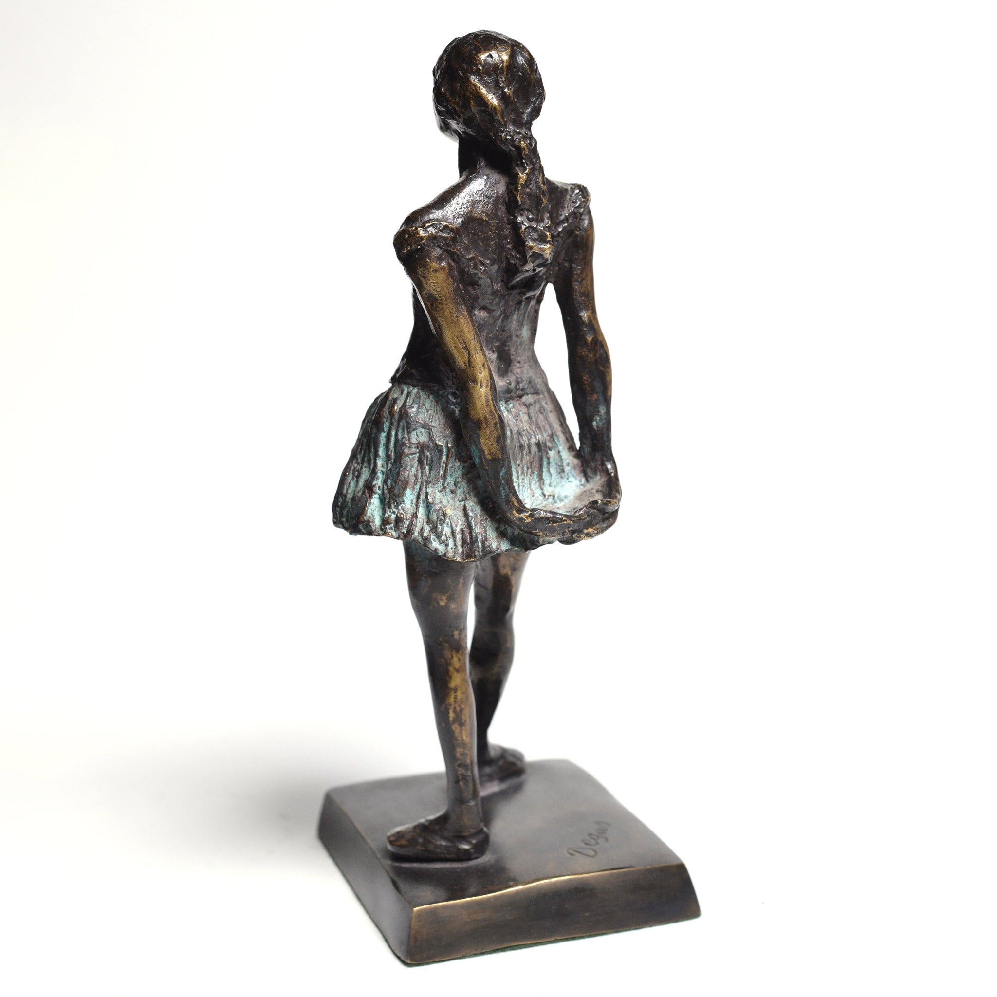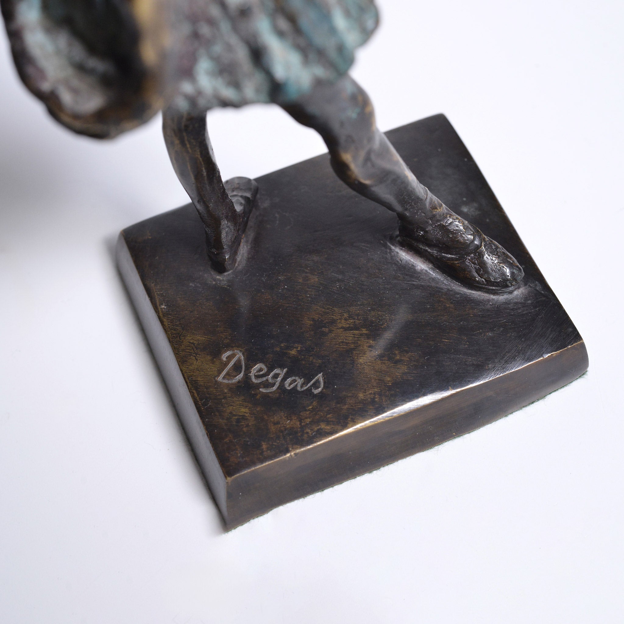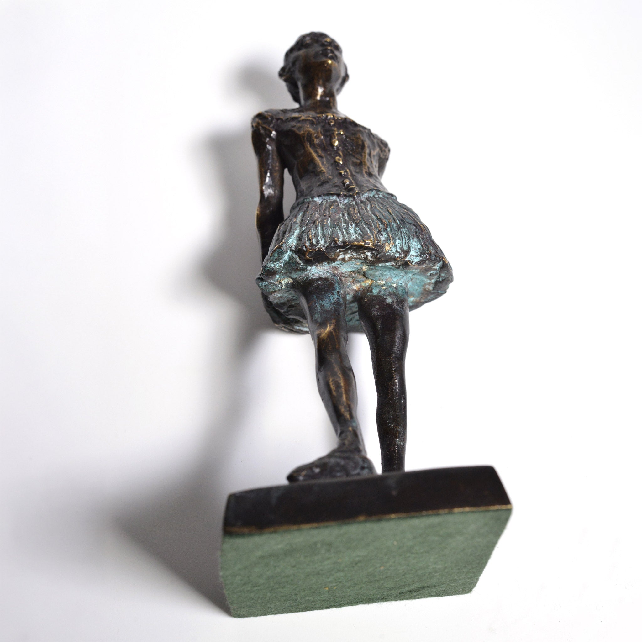 This magnificent bronze sculpture, cast in the first half of the 20th century, represents a masterful reinterpretation of Edgar Degas' iconic masterpiece, "Little Dancer of Fourteen Years". The work brilliantly captures a fleeting moment of rest during an intense ballet rehearsal. A complex two-tone patina lends the sculpture a particular aesthetic elegance: the deep dark-brown hue of the figure itself contrasts strikingly with the rich green patina on the ballerina's tutu. The textured, deliberately sketch-like surface of the metal masterfully imitates Degas' extraordinary modelling style, catching the slightest play of light and shadow. It is a deeply emotional work of art, capable of filling any interior with the charm of French Impressionism.