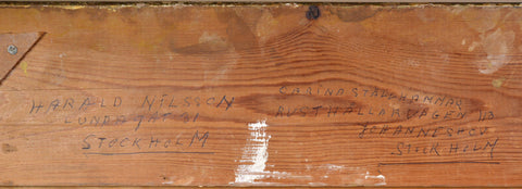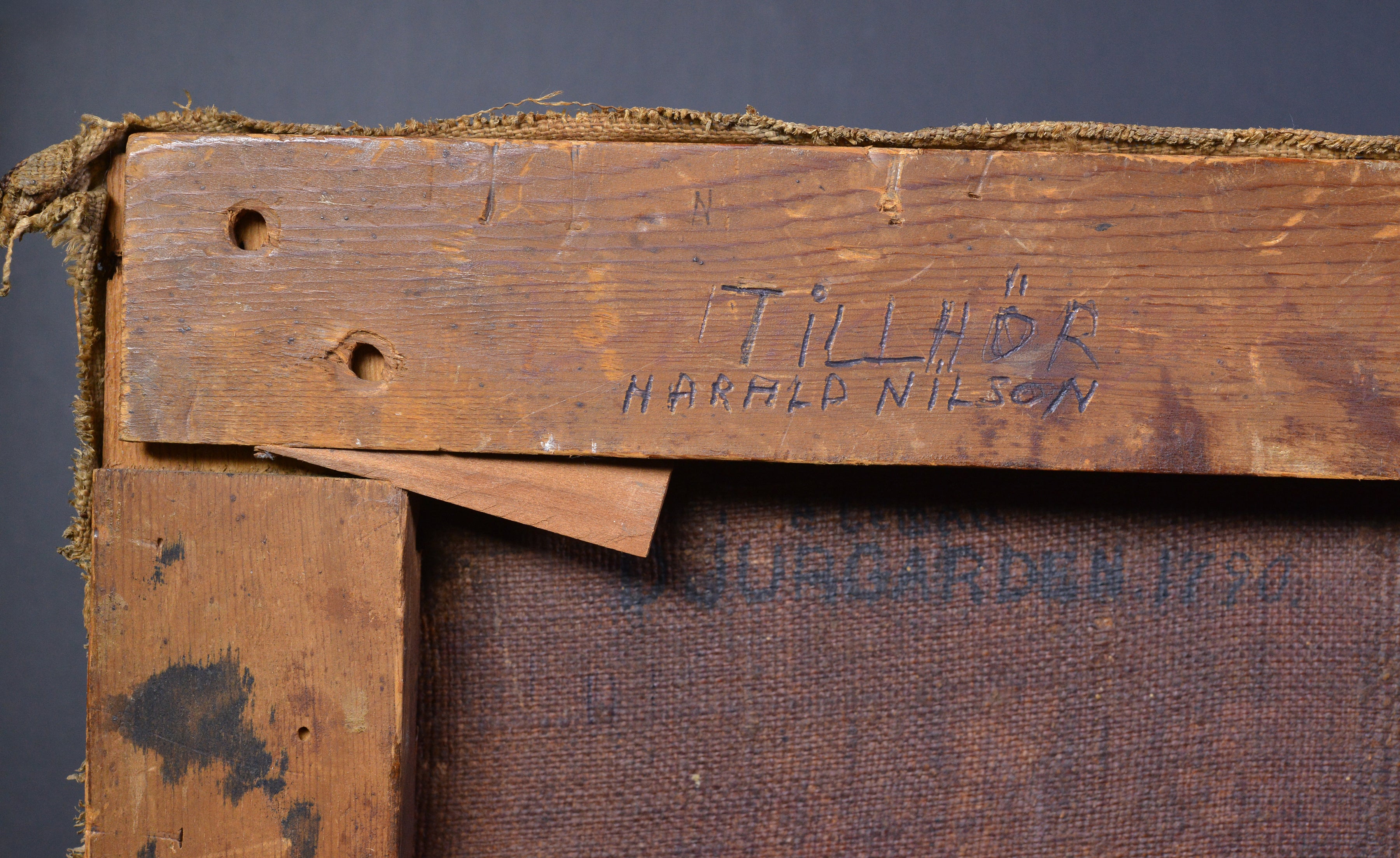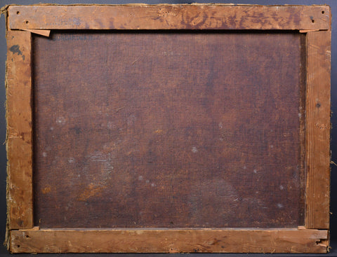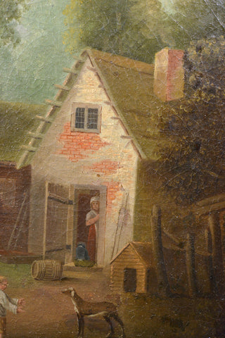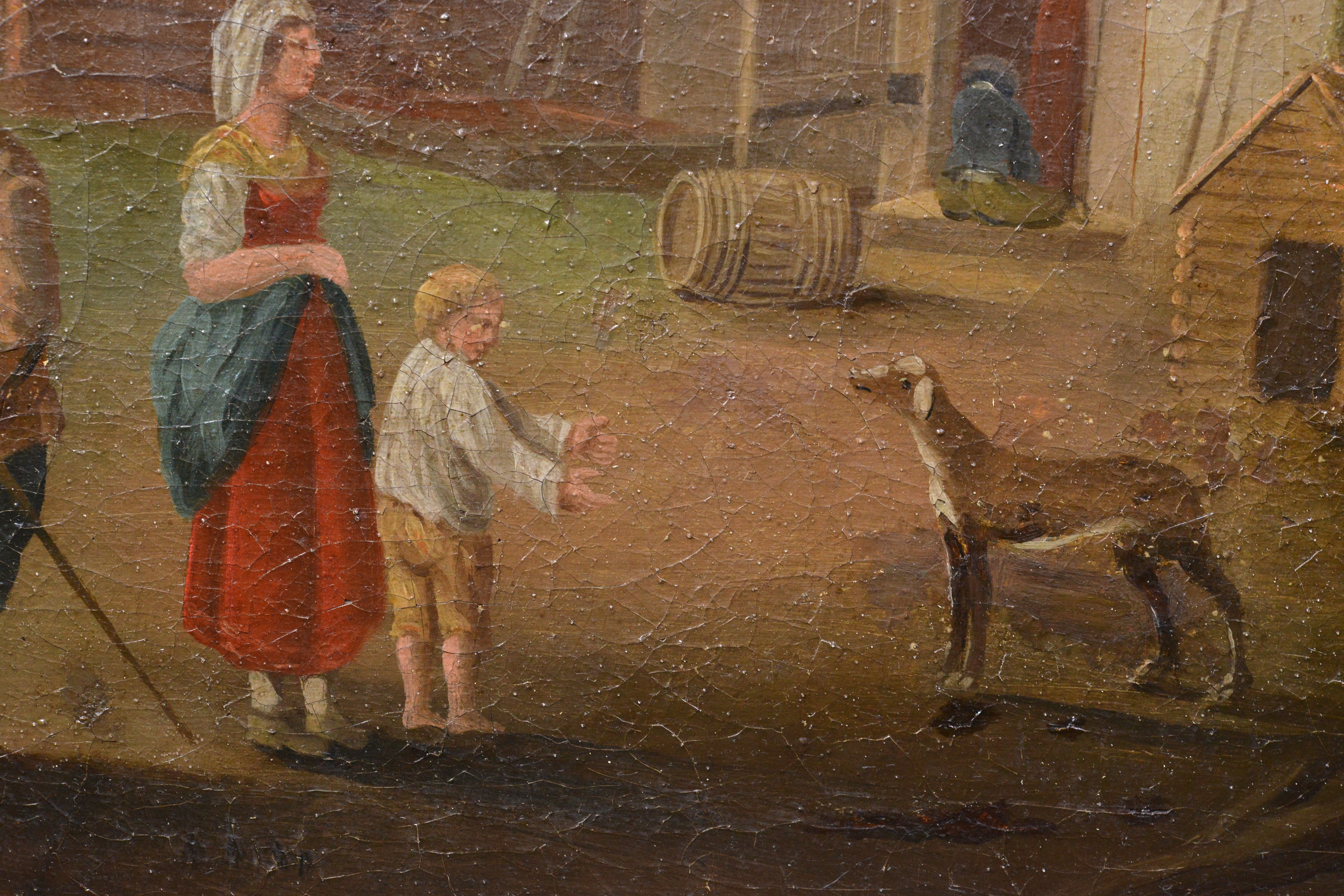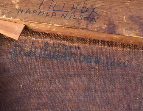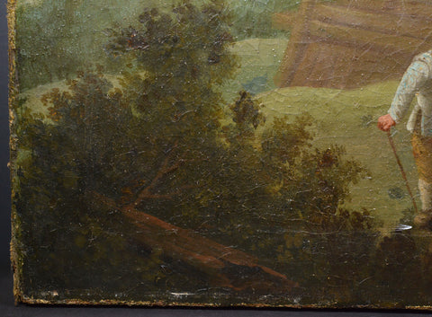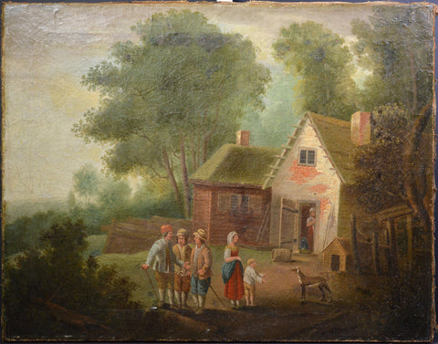 This rare 1790 oil painting depicts a village landscape in the Old Masters genre tradition. The composition shows peasants gathered near a cottage surrounded by lush forest, engaged in animated discussion, while a woman with a child has her attention drawn to a delightful dog. Historical inscriptions on the reverse reference Djurgården, the picturesque island in central Stockholm that once served as royal hunting grounds. Though the artist's name remains unidentified, the work characteristically demonstrates the Old Masters style in the Dutch tradition and represents a fascinating example of 18th-century artistic cultural heritage with an intriguing history.