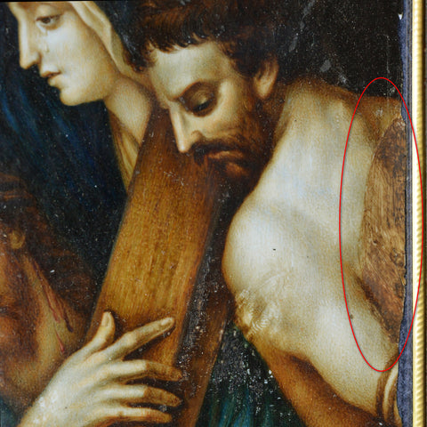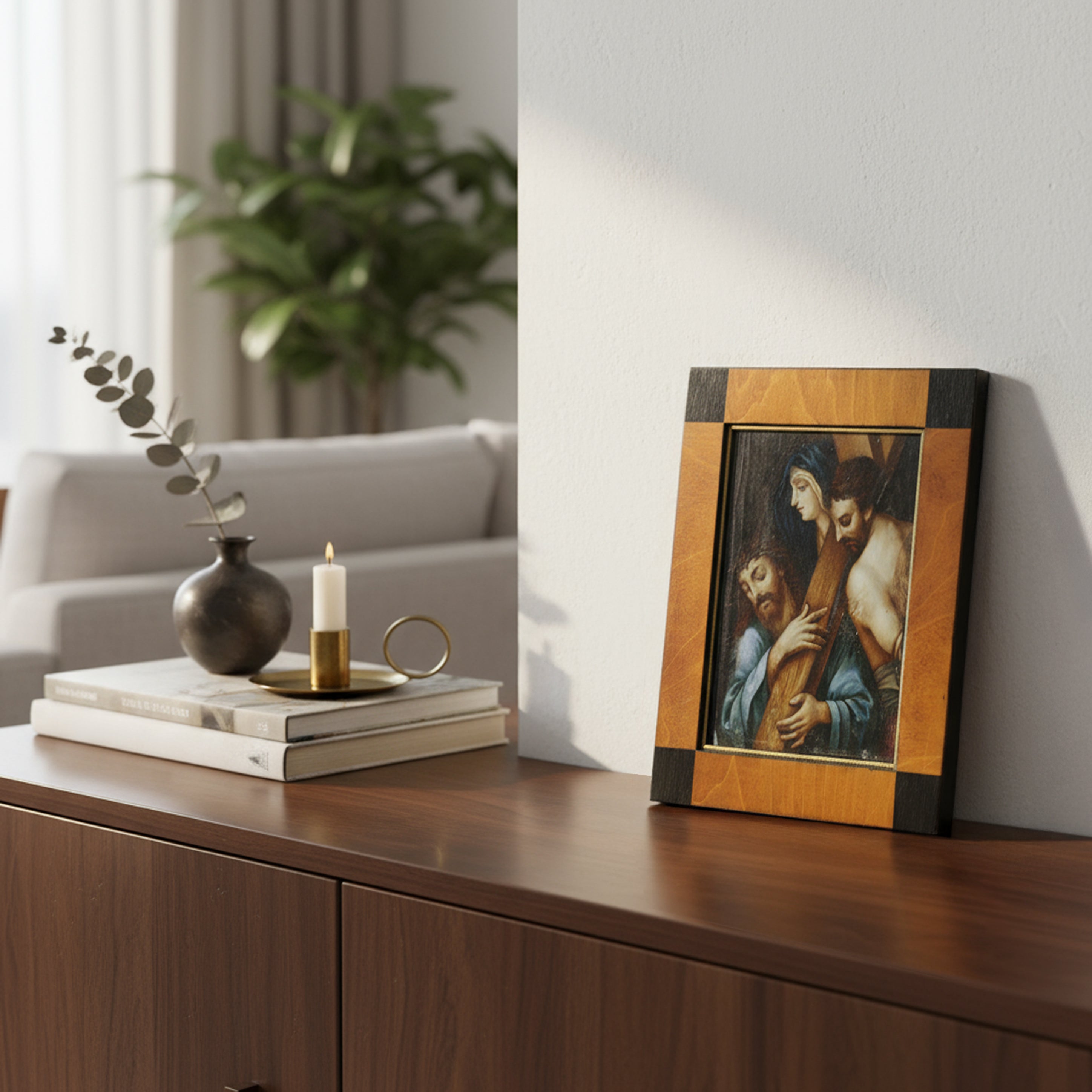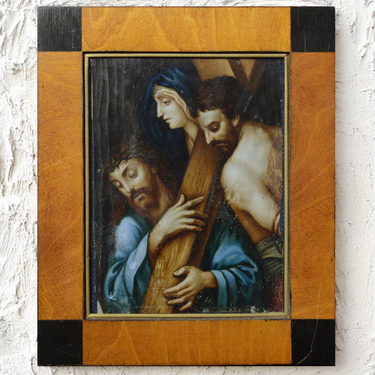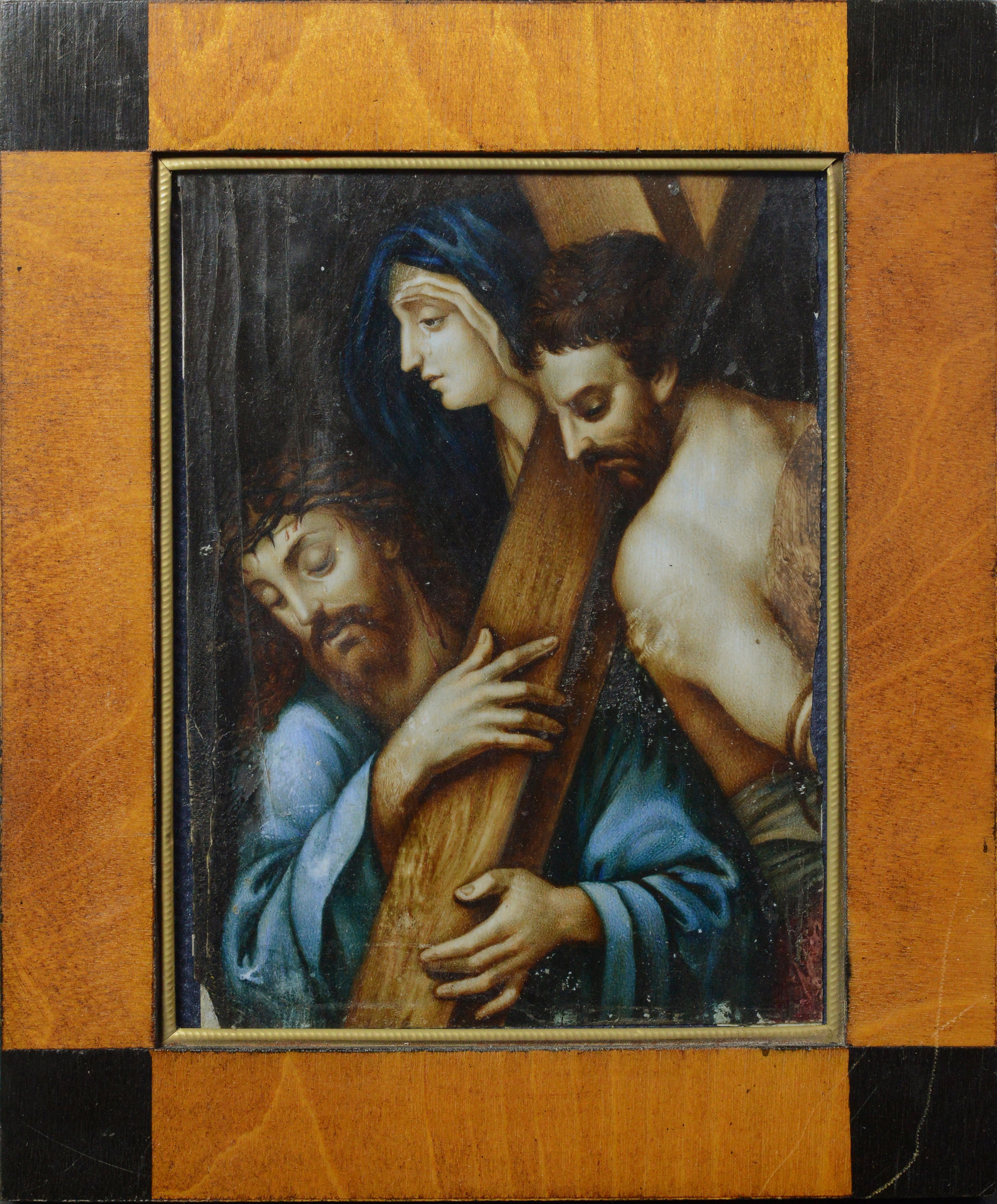 This exceptional late 18th century miniature depicts a sorrowful moment from the Passion of Christ: Jesus carrying his cross to Calvary. The composition focuses on three central figures: Christ bearing his cross, the grieving Virgin Mary with an expression of profound sorrow, and Simon of Cyrene who was compelled to assist Jesus with his burden. The emotional and spiritual atmosphere is enhanced by skillfully rendered figures, demonstrating the artist's undeniable mastery. A fine example of devotional painting, ideal for discerning collectors of Christian iconography and European religious art
